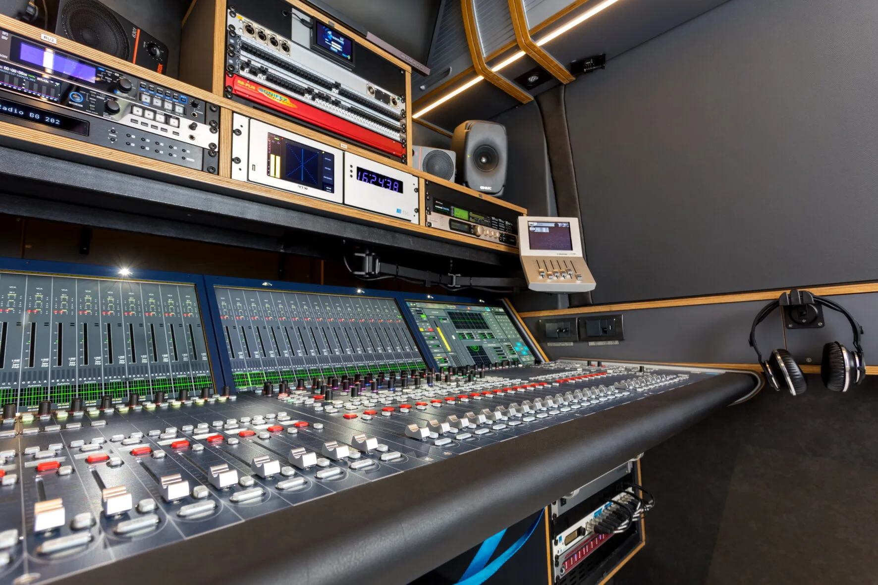 “The heart of the system is a 40-fader Lawo mc²36 All-in-One audio mixing console and two compact stage boxes, each with 32 mic/line inputs and 16 line outputs” says Bora Radojevic, Managing Director of TSE. “The IP-based Lawo equipment was easily integrated by using two MADI ports on the back of the console, the third MADI port we used to feed a TASCAM DA-6400 multitrack recorder. The local I/Os provided by the mc²36 were more than enough to connect with the recording and playback equipment, monitoring PPM, et cetera. The additional Lawo A_digital8 is used for TC ELECTRONIC Music 6000 multichannel effect unit. The great sound of the Lawo is monitored by a pair of Genelec 8331A full range and Genelec 7350A subwoofer active monitors.”