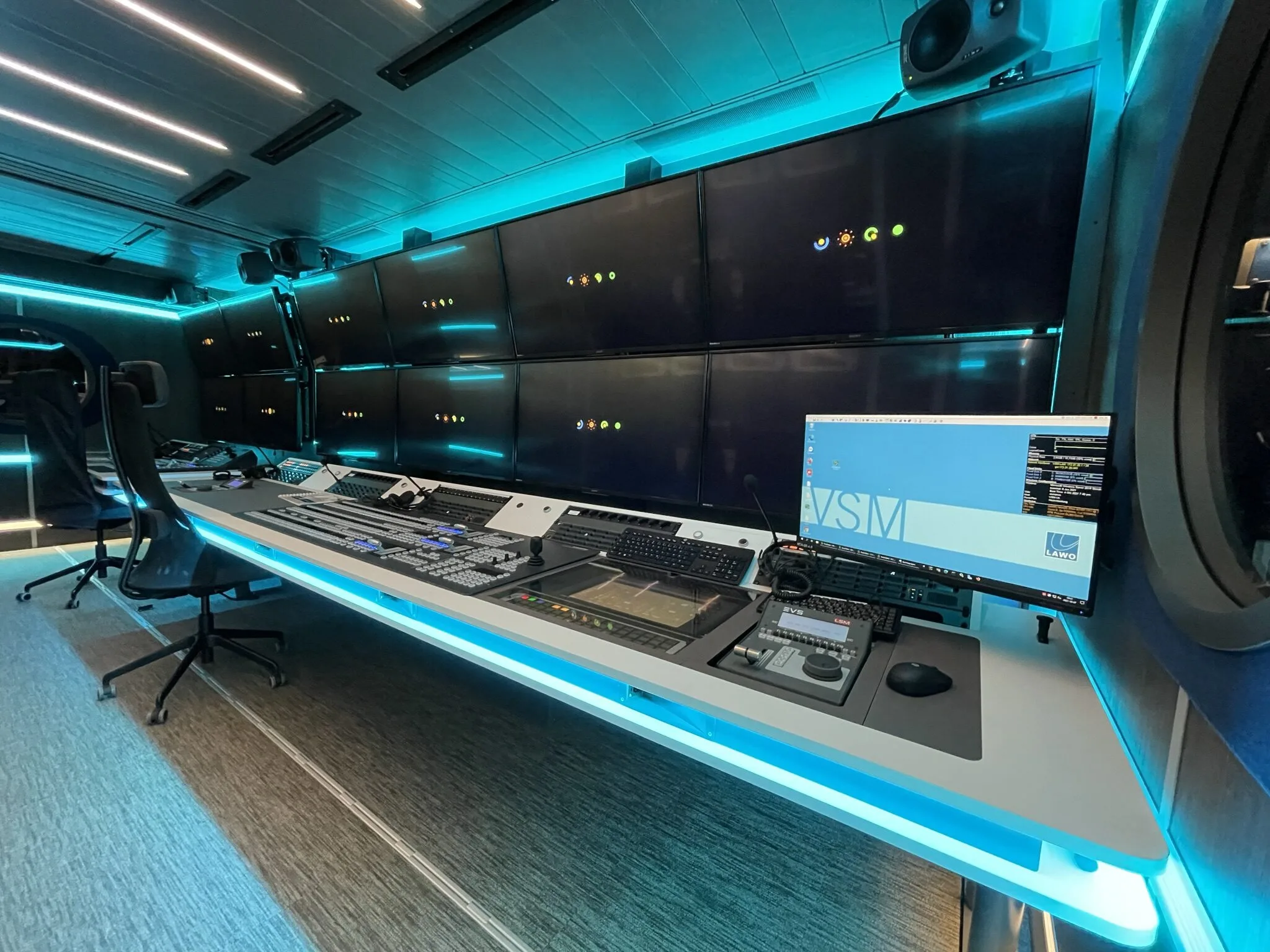 The two Lawo mc² consoles in the OB van are each outfitted with fully redundant A__UHD cores. Each stand-alone core delivers 1,024 channels of audio processing (48/96kHz) and offers numerous monitoring options as well as downmixing and upmixing. A__UHD technology is based on open AoIP standards such as ST2110-30 / -31 and AES67/RAVENNA, and utilize Ember+ and NMOS for control. For large productions, the vehicle can access up to eight video and audio stage boxes.
